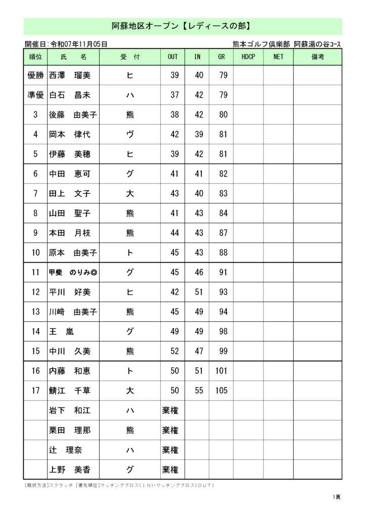 阿蘇地区オープンゴルフ大会【レディースの部】順位表
