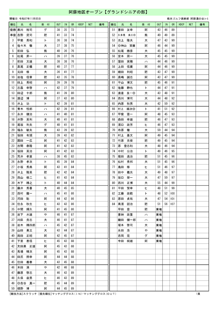 阿蘇地区オープンゴルフ大会【グランドシニアの部】順位表